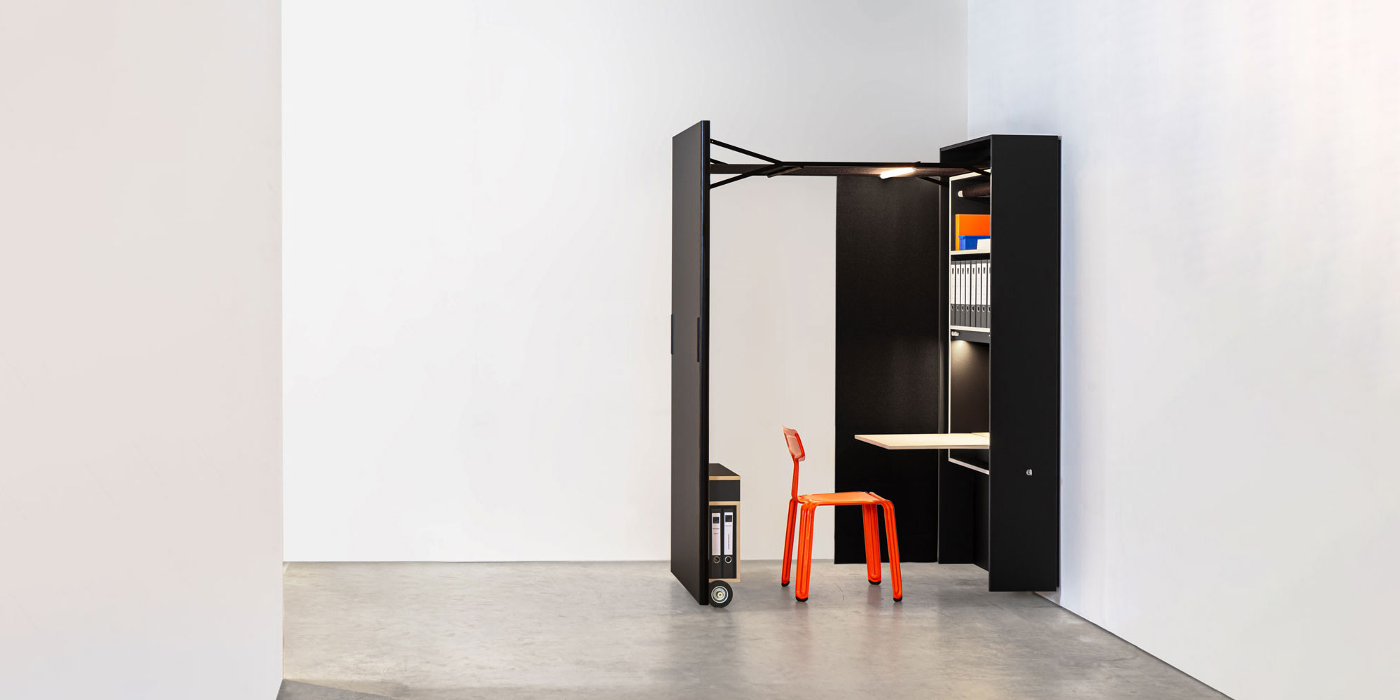 Geschlossen so groß wie ein schmaler Wandschrank, entfaltet sich DER VORSTAND mit einem Zug in eine multifunktionale Denkzelle.